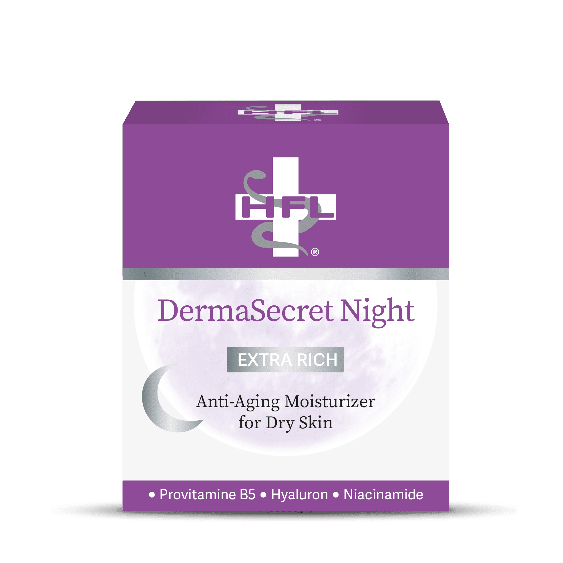DermaSecret Night is een extra rijke nachtcrème die de droge en trekkerige huid herstelt terwijl jij slaapt. De formule is opgebouwd rond huideigen squalane en natuurlijke sheaboter, die samen de huidbarrière versterken en vochtverlies actief tegengaan. Resultaat: een soepelere huid die comfortabel en gevoed aanvoelt.